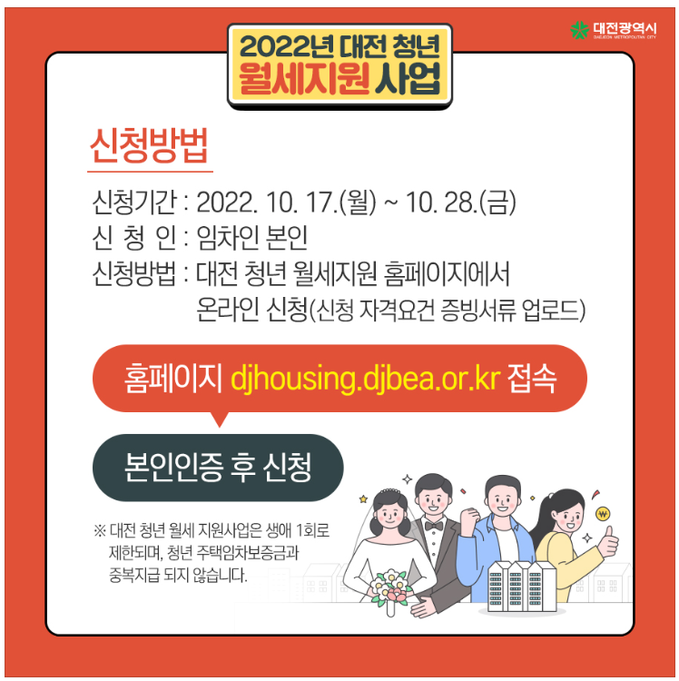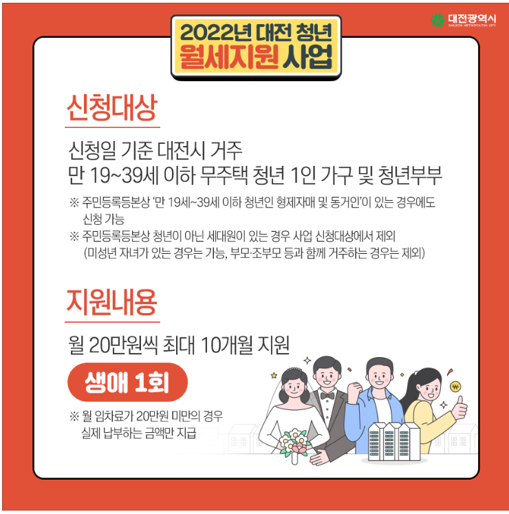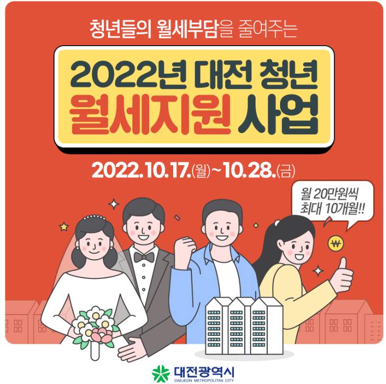 대전광역시에서는 청년들의 주거비용 부담을 완화하고 안정적인 주거 생활 지원을 위해「2022년 대전 청년 월세 지원」 사업을 시행합니다~