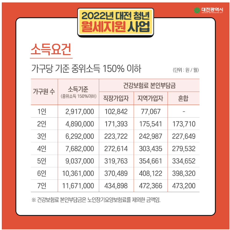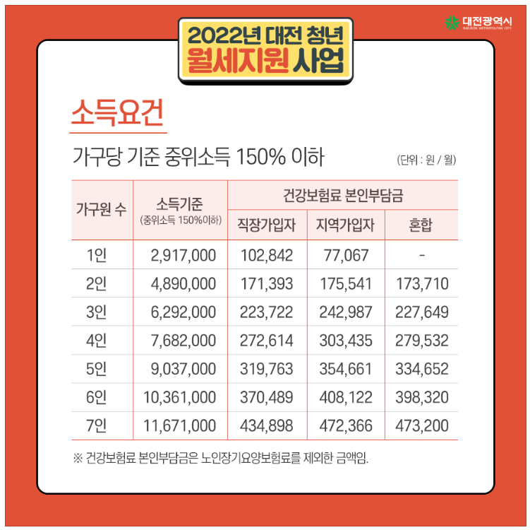 - 신청인이 속한 가구의 건강보험료 부과액(ʹ22년 7~ 9월까지 3개월 평균액)이 ʹ22년 기준중위소득 150%의 건강보험료 부과액을 충족해야 함.